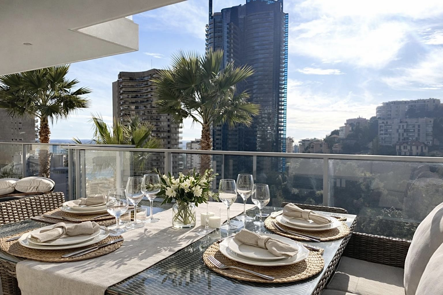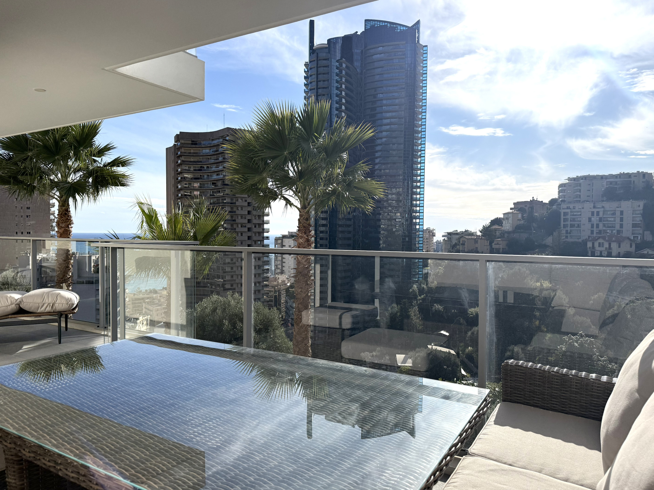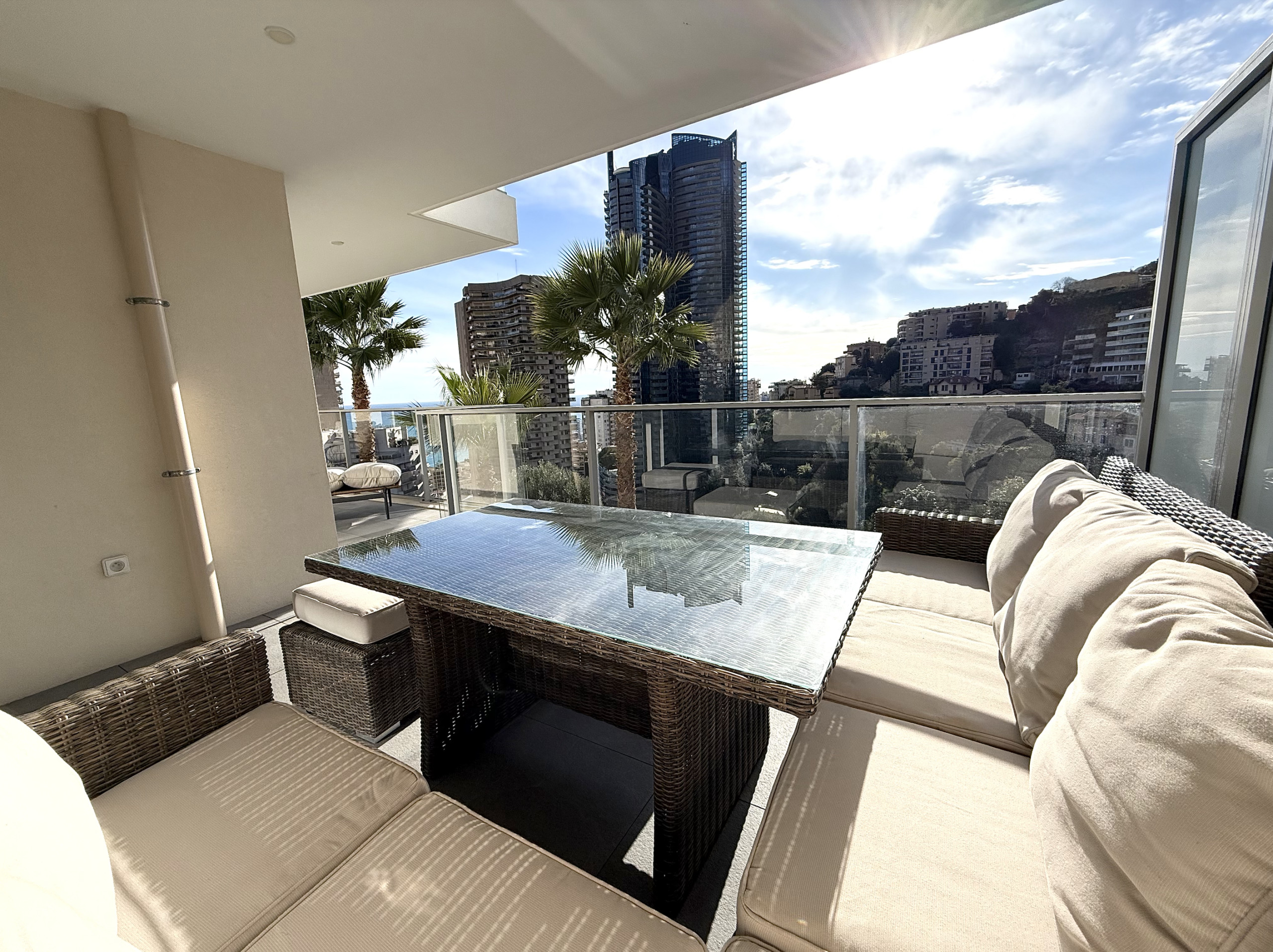 Large and bright two bedrooms full exposure South, a few minutes walk from Monaco, with swimming pool and parking. A terrace with sea view, dining area and garden furniture to enjoy breakfast, lunch or dinner anytime of the year thanks to the rather mild climate of the Cote d'Azur.